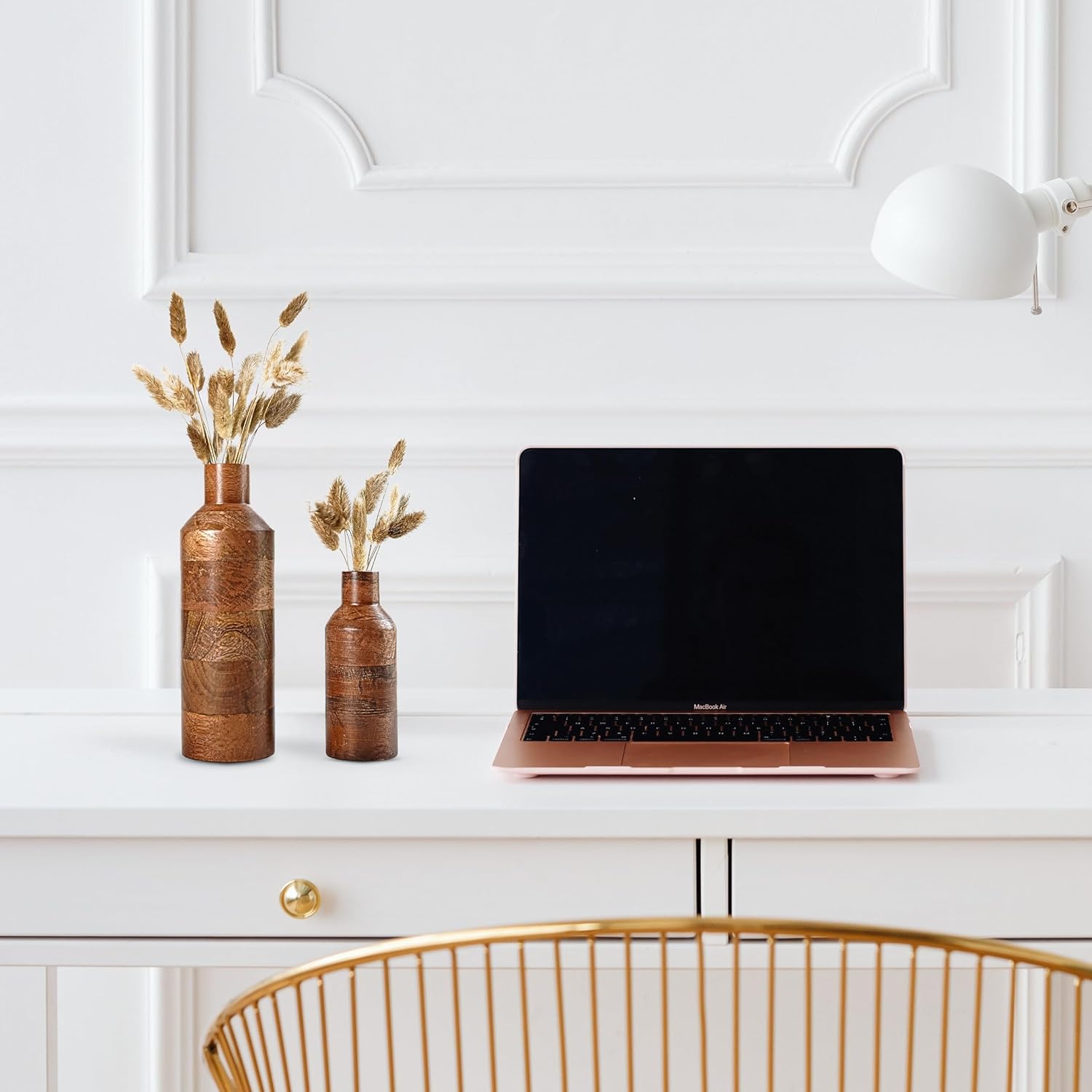 Bring the serene beauty of nature indoors with our Handcrafted Mango Wood Vase Set. These stunning bottle-style vases feature a unique, multi-tonal wood grain that adds instant texture and warmth to any room. Designed with a minimalist, cylindrical silhouette and a narrow neck, they are the perfect vessel for showcasing dried botanicals, faux stems, or trendy pampas grass. Whether displayed together as a tiered duo or placed separately to tie a room’s decor together, these vases offer a timeless Boho-Modern aesthetic.