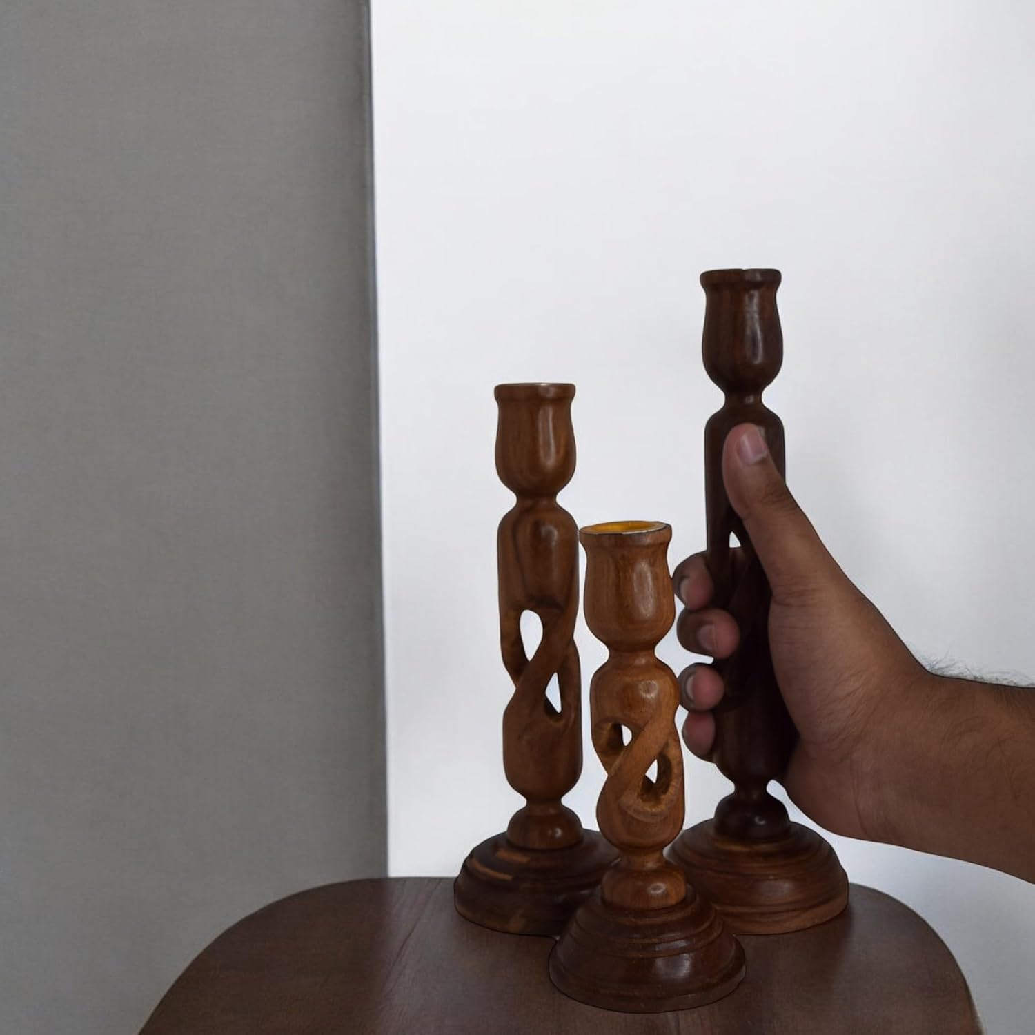 Bring warm, timeless elegance to your home with this Handmade Sheesham Wood Spiral Candle Holder Set, crafted by skilled artisans for a luxurious rustic charm. These wooden candle holders feature beautifully carved spiral designs that instantly elevate your living room décor, dining table setup, bedroom ambiance, or festive decorations.