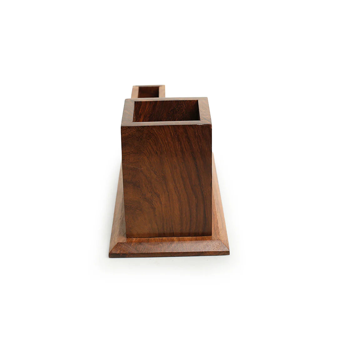 Organize your workspace with artistic flair using this handcrafted wooden stationery organizer, meticulously carved from premium sheesham wood for a timeless, durable finish. This multi-compartment desktop storage unit features a dedicated pen holder and a tiered section for sticky notes or business cards, all anchored on a sleek wooden base. Each piece is adorned with a striking hand-etched rhombus motif, adding a touch of geometric modernism to its traditional rustic office decor appeal. Ideal for use as a table stationery holder or a professional desk tidy, this artisanal wooden organizer combines high-quality Indian craftsmanship with practical design to keep your essential office supplies within reach.