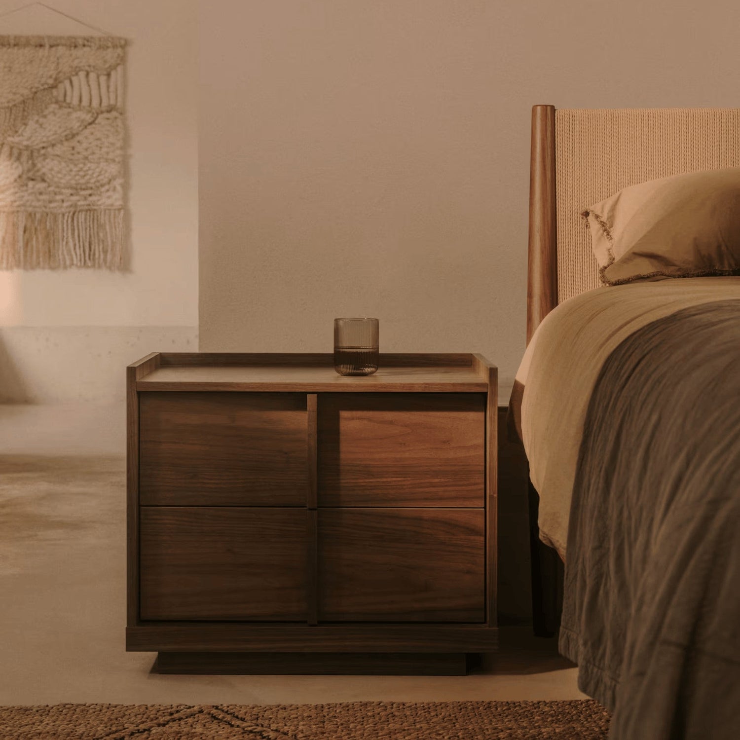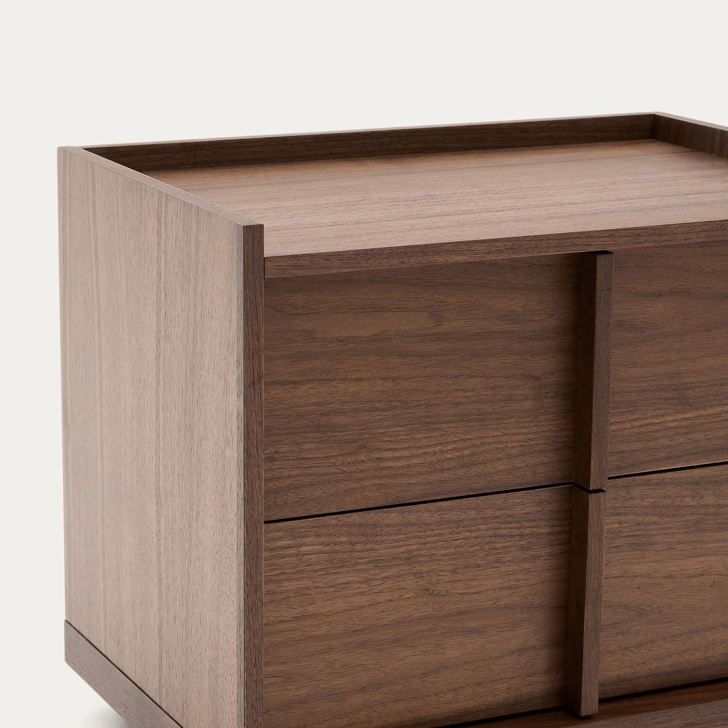 This sophisticated bedside table, crafted from rich, dark wood, offers a sleek and minimalist design perfect for modern interiors. Its unique construction features an elevated top surface and subtly recessed drawers, creating clean lines and a floating aesthetic. With ample storage hidden behind two smooth-fronted drawers, this piece provides both discreet organization and a touch of refined elegance to any bedroom.