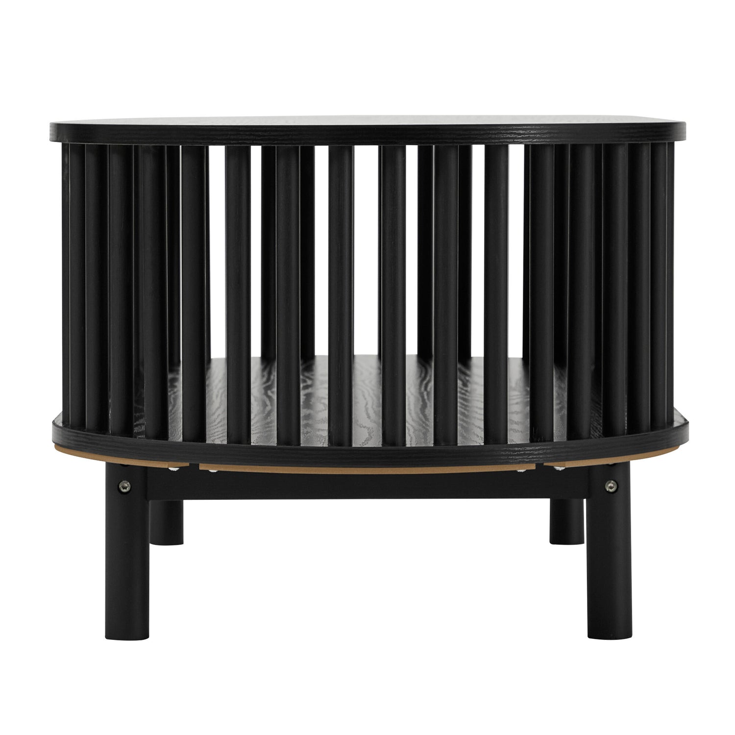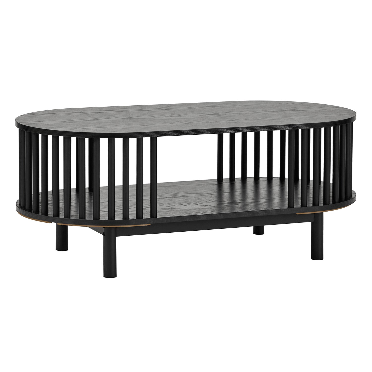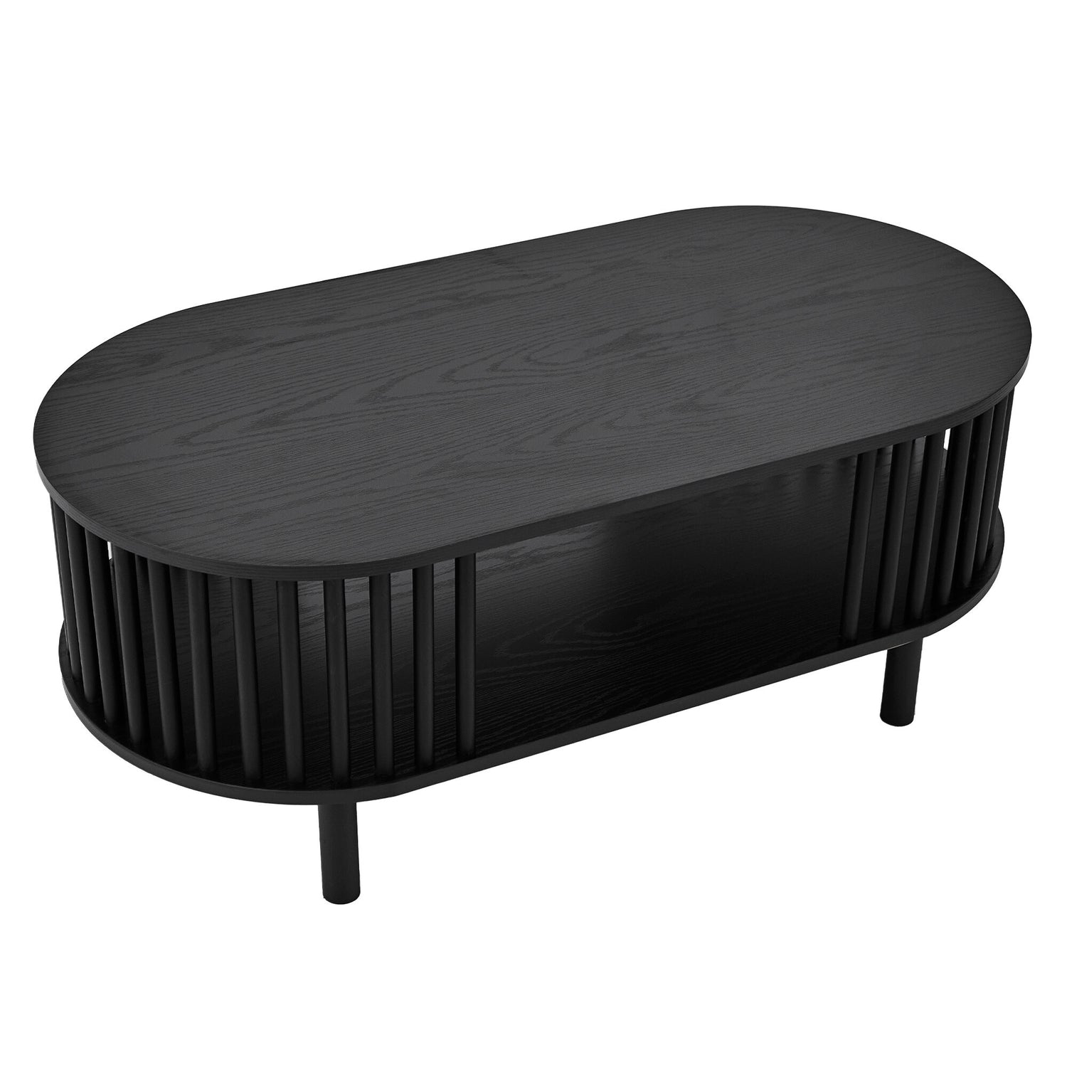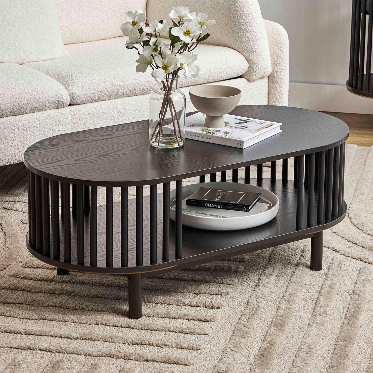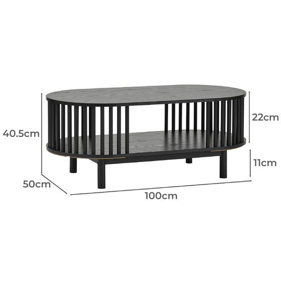 This striking oval coffee table features a unique black fluted base that creates a visually captivating texture and a sense of modern elegance. Its design includes an open central shelf, offering convenient storage or display space while maintaining a sleek, airy aesthetic. Supported by subtle legs that integrate seamlessly, the Hollie coffee table is a sophisticated and functional centerpiece for any contemporary living room.
