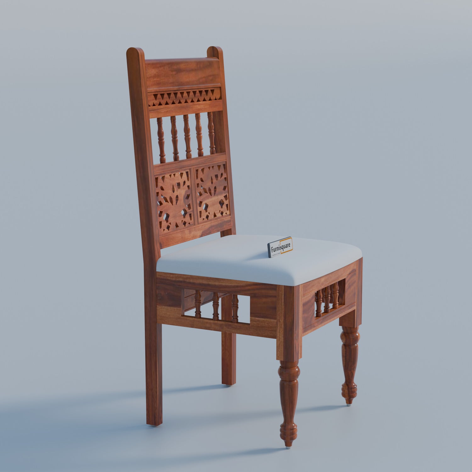 This charming dining set features a square table with beautifully turned legs and intricate slatted detailing along its sides. The set is composed of four chairs, two with ornate carved backrests and two with simpler, elegant designs, all complemented by cushioned seats. Crafted from warm-toned wood, this ensemble offers a perfect blend of traditional craftsmanship and functional design, ideal for creating a cozy and stylish dining nook.