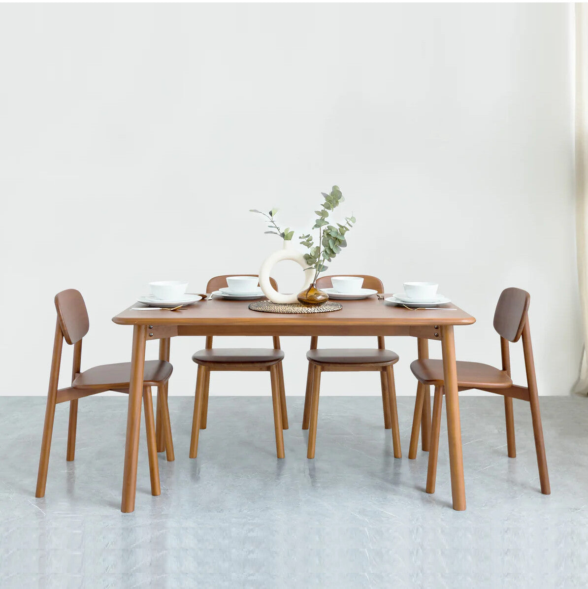 This contemporary dining set features a sleek rectangular table with gently rounded corners, offering a clean and inviting aesthetic. Paired with four elegantly designed chairs, each boasting a subtly curved backrest and a comfortable upholstered seat, this set provides both style and comfort. Crafted in a warm brown wood finish, it's a perfect blend of modern simplicity and timeless charm, ideal for creating a cozy and functional dining space.
