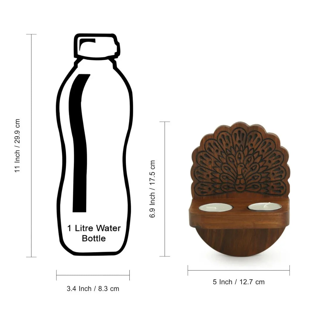 Illuminate your home with a touch of ethnic grace using this handcrafted wooden wall tealight holder, expertly carved from premium sheesham wood for a rich, durable finish. This elegant wall-mounted candle sconce features a scalloped backplate adorned with a majestic hand-etched peacock motif, showcasing intricate traditional Indian artistry that serves as a stunning piece of wall decor. Designed with a sturdy small shelf to securely hold two tealight candles, it casts a warm, inviting glow that enhances the ambiance of your living room, entryway, or prayer space. Perfect as a unique housewarming gift or a festive decoration, this artisanal wooden tealight stand seamlessly blends rustic charm with timeless sophistication to elevate any interior setting.