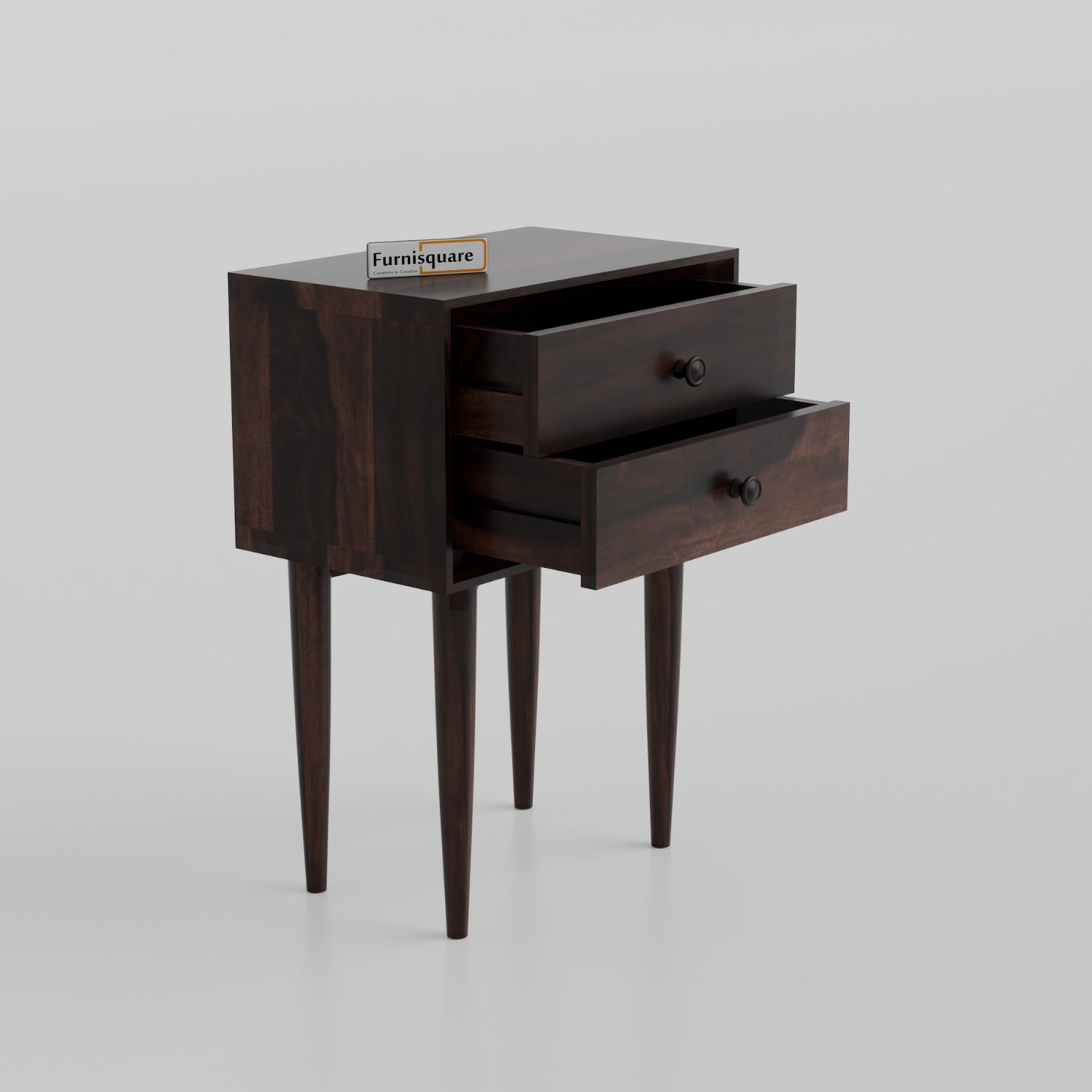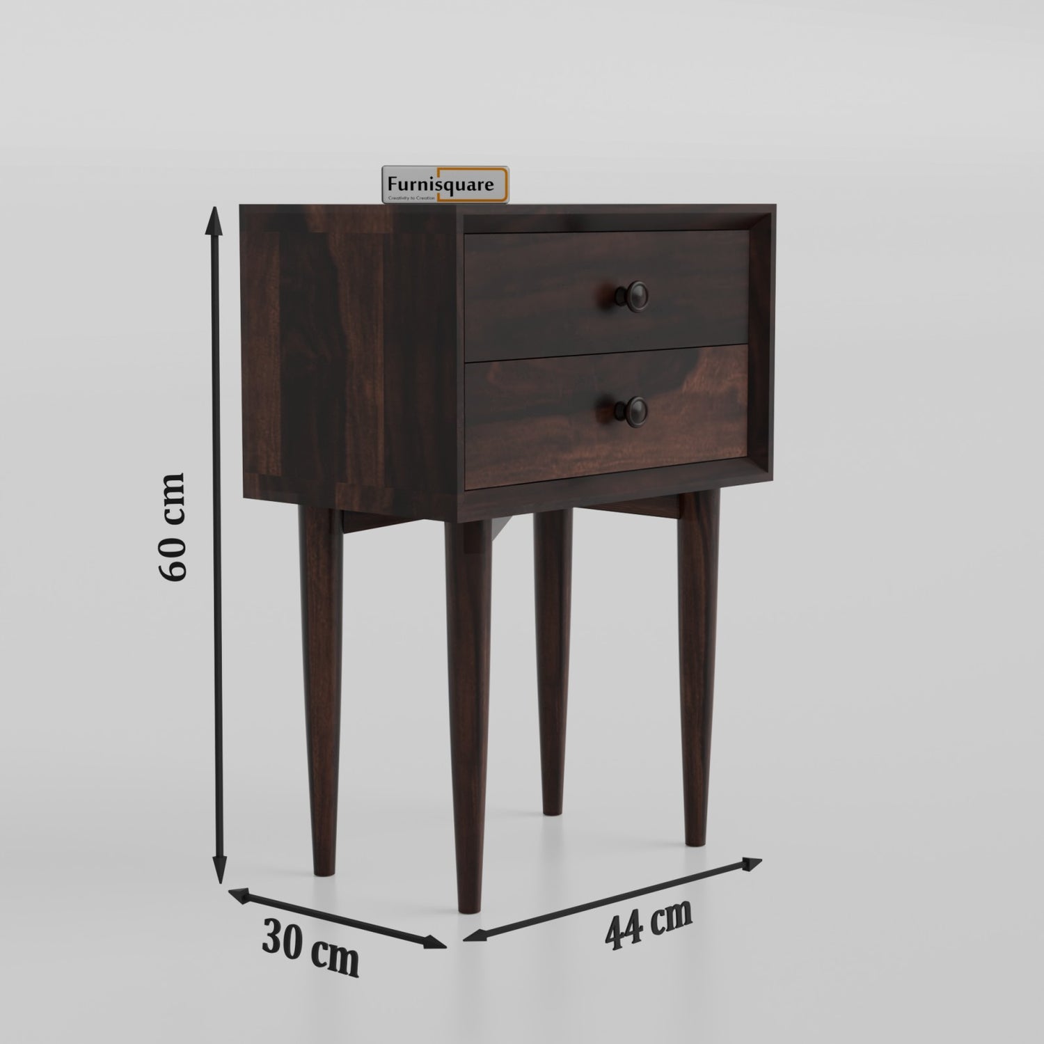 Elevate your bedroom with this sophisticated handcrafted wooden bedside table, expertly made from high-quality sheesham wood for long-lasting durability. This elegant 2-drawer nightstand features a sleek mid-century modern design with tall, tapered legs that provide a light, contemporary feel to your home decor. The two spacious drawers, accented with classic round wooden knobs, offer ample storage for bedside essentials, while the wide tabletop easily accommodates a lamp, alarm clock, and books. Whether utilized as a side table in a cozy living room or a functional bedroom chest, this artisanal wooden furniture piece by Furnisquare perfectly blends rich natural wood grains with modern utility to enhance any interior space.