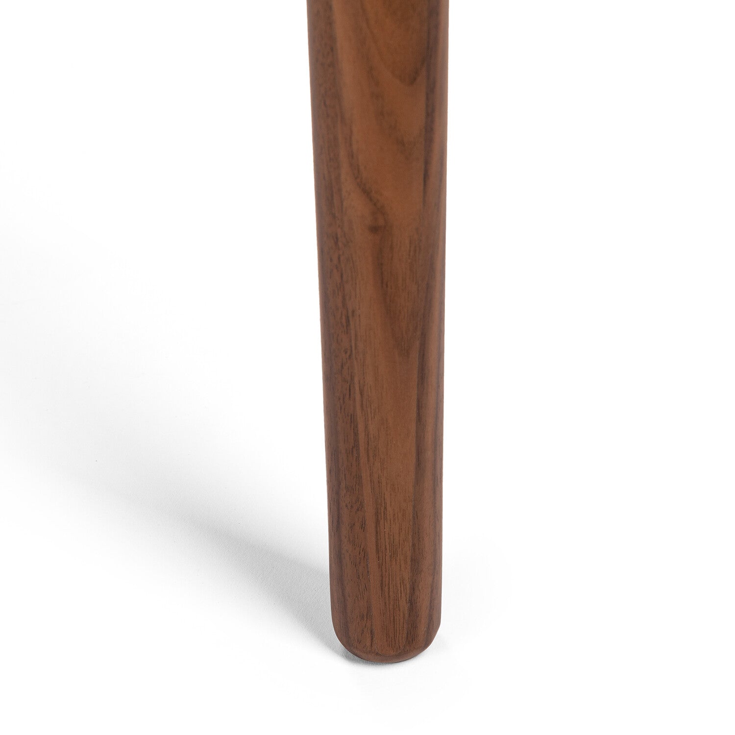 This elegant writing desk brings a classic mid-century modern look to your home office or study. Featuring a rich walnut finish and stylish tapered legs, it offers a sophisticated and functional workspace. The two discreet drawers provide convenient storage for office supplies, while the open shelf is perfect for keeping your work organized. This desk is a timeless piece that combines aesthetic appeal with everyday utility.