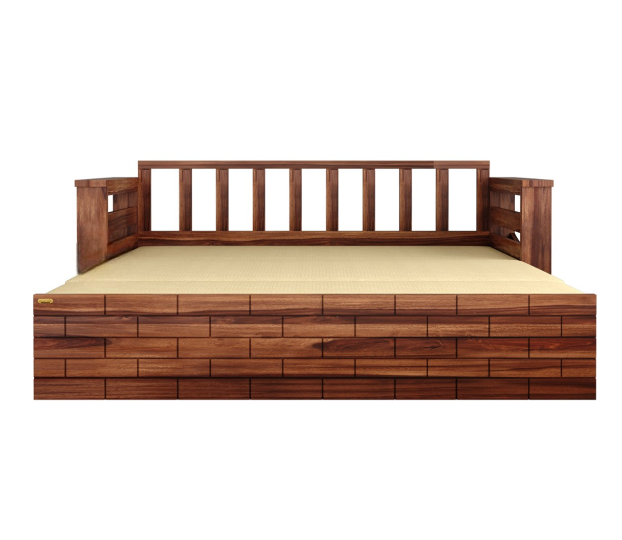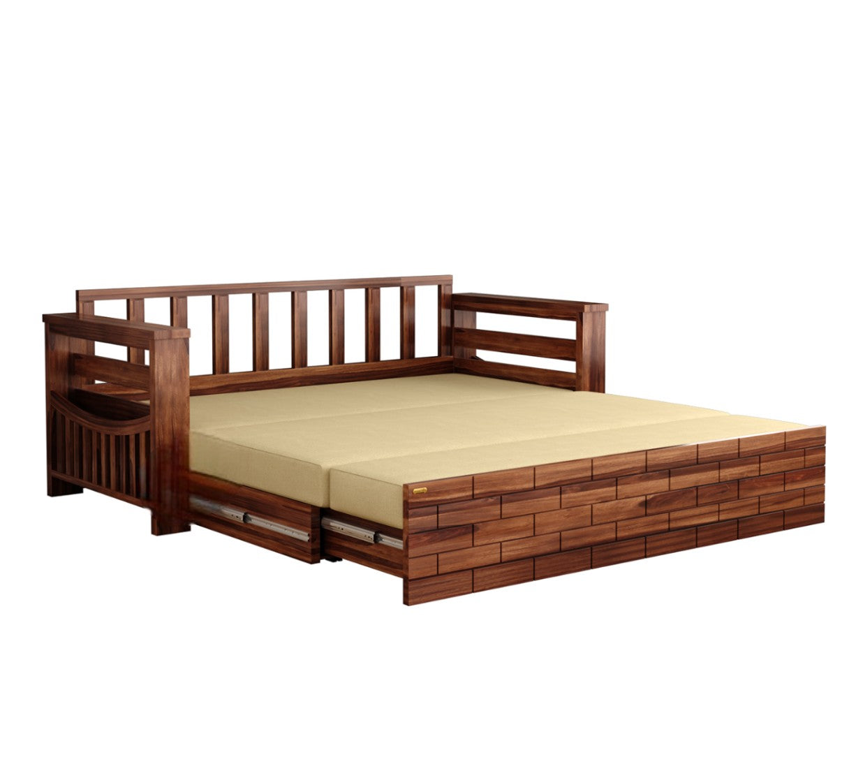 This functional piece is a wooden sofa cum bed that seamlessly combines the utility of seating and a sleeping surface, making it ideal for multi-purpose rooms. The frame features a classic design with a slatted high backrest and sturdy vertical-slat wooden armrests. The large, neutral-colored mattress provides a generous seating area that easily extends to become a comfortable bed. For added functionality, it incorporates a magazine or storage rack built into the left armrest and includes a discreet pull-out storage drawer beneath the main body, efficiently maximizing space in compact living environments. The look is softened by two accent pillows with a light, leafy pattern.