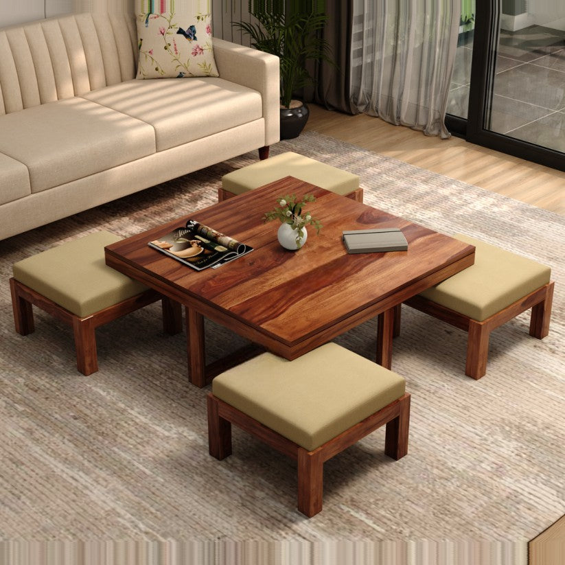 Upgrade your living room with this Premium Solid Wood Coffee Table, designed with a space-saving seating solution and built-in storage for modern homes. Made from high-quality Sheesham wood, this center table with 4 cushioned stools offers durability, elegance, and complete functionality for everyday use. This wooden coffee table with stools enhances the interior while giving you additional seating without occupying extra floor space. Whether you're looking for a modern living room furniture piece, a stylish center table, or a solid wood home decor upgrade, this table is the perfect addition.