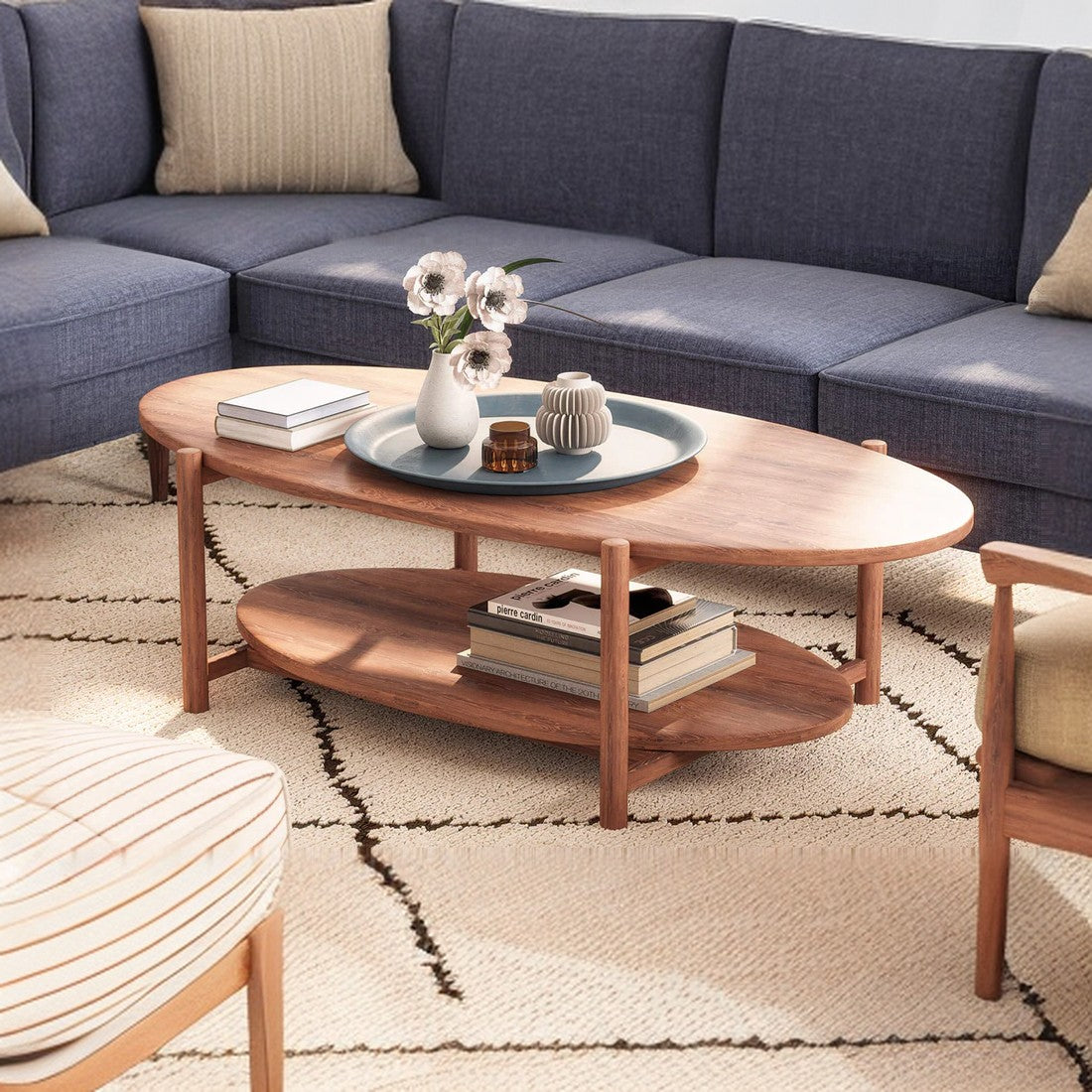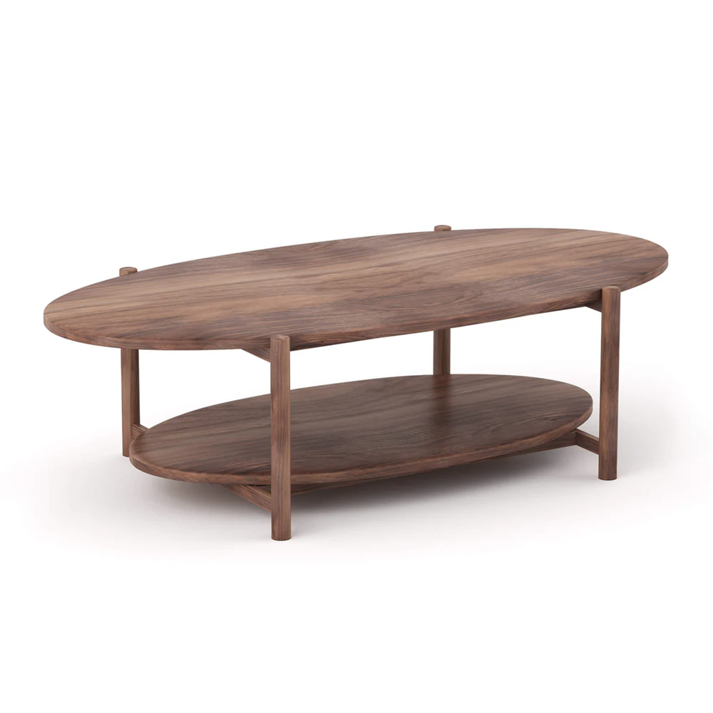 Embrace timeless design with the Iris Oval Coffee Table. Crafted from rich, inviting walnut wood, this piece captures the essence of mid-century modern style with its elegant oval shape and clean lines. Featuring a spacious double-tier design, it offers ample surface area for decor and a convenient lower shelf for books, magazines, or everyday essentials, making it both a beautiful focal point and a highly functional addition to any living space.