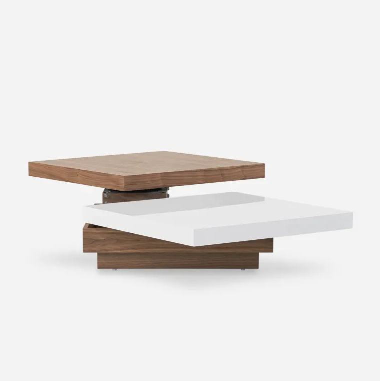 Introducing the Andre Extendable Swivel Coffee Table, a modern marvel designed for dynamic living spaces. This innovative piece features two square tiers, one in crisp white and the other in a rich wood tone, that effortlessly swivel to expand your surface area or tuck neatly away. A clever hidden drawer beneath the top tier provides discreet storage for remotes, magazines, or essentials, keeping your living room organized and chic. Perfect for contemporary interiors seeking adaptable and stylish furniture.