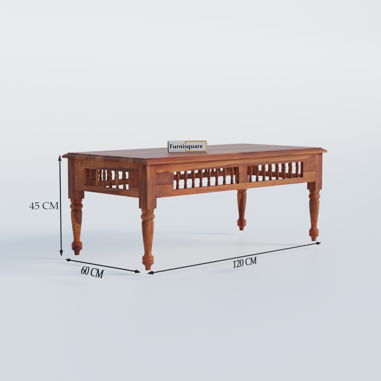 Upgrade your living space with this elegant handcrafted solid wood rectangular coffee table. Designed with a smooth polished finish, traditional spindle detailing, and sturdy legs, it blends strength with timeless charm. Perfect for serving coffee, placing décor, or keeping magazines handy, this versatile wooden table adds warmth and sophistication to any living room setting.