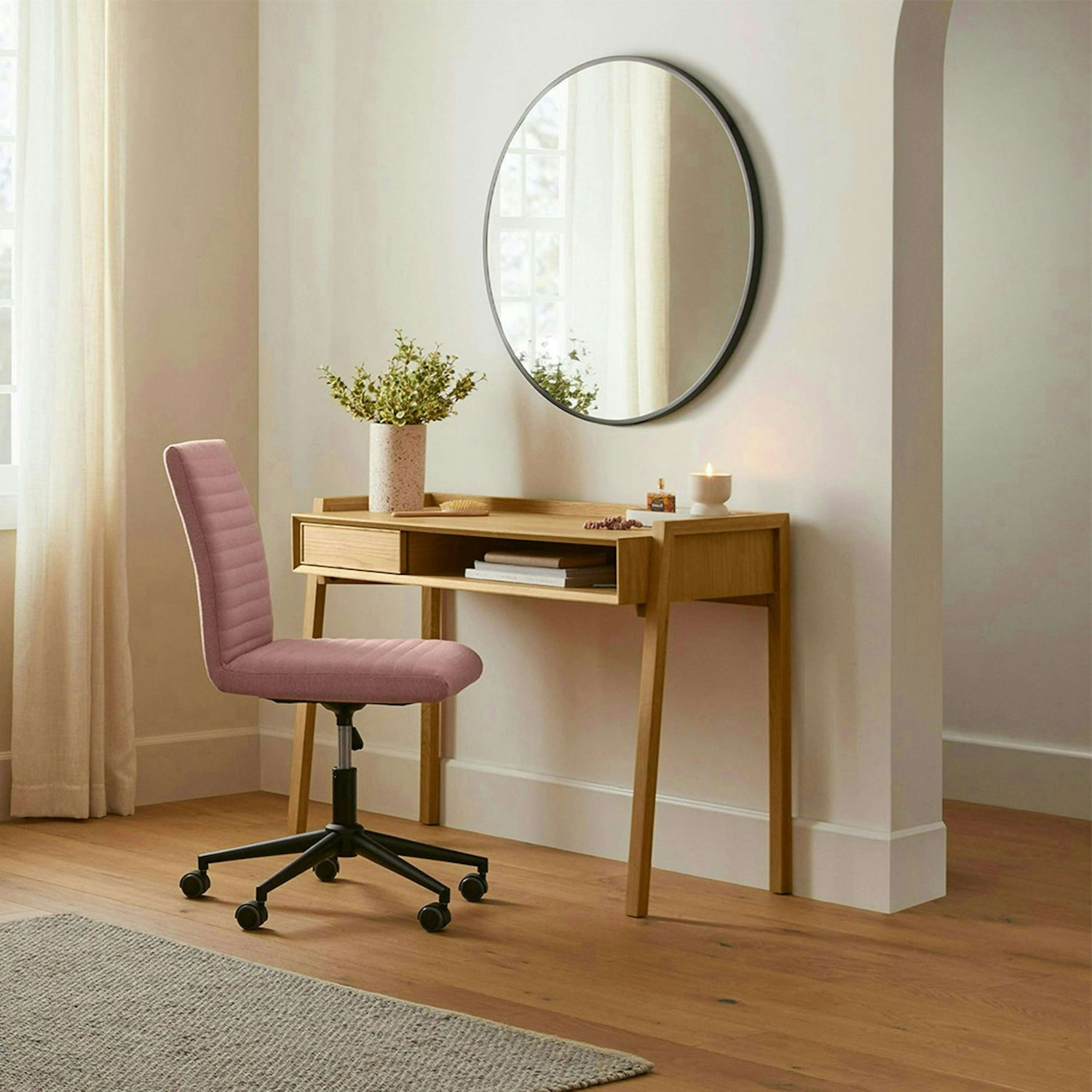 This beautiful and versatile desk is the perfect addition to a home office, bedroom, or entryway. Its minimalist design and clean lines, crafted from light, natural wood, embody a modern Scandinavian aesthetic. The desk features a spacious top with a convenient open shelf and a discreet pull-out drawer, providing both a functional workspace and a perfect spot for essentials, all while maintaining a light and airy feel.